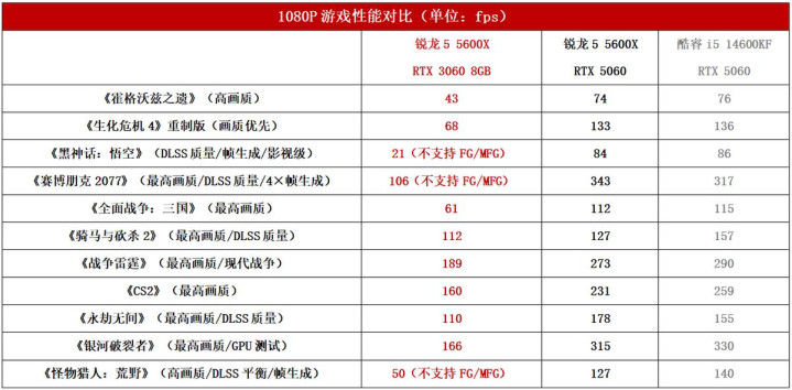从测试结果可以看到,RTX 3060 8GB这样的上上代甜品,在应对《霍格沃兹之遗》《黑神话:悟空》《怪物猎人:荒野》等要求较高的游戏时已经力不从心了,高画质下很难提供流畅帧率,离60fps及格线还比较远。毕竟RTX 3060不支持帧生成,和RTX 40/50系拉开了很大的差距。当然,在要求没那么高的电竞游戏里,RTX 3060 8GB还是能够一战的,超百帧的流畅度可以满足需求。 如果我们把显卡换成现在主流的RTX 5060,那么可以看到在更高级的架构和多帧生成加持下,RTX 5060的游戏帧率表现高出一大截,一些游戏还有超出一倍甚至几倍的提升。当然,RTX 5060现在都已经涨到3000元出头了,5000元预算装机恐怕拿不下来,受不了RTX 3060 8GB的玩家只能加钱。 不过我们对比同为DDR4平台、2023年上市的酷睿i5 14600KF的话,可以看到2020年上市的Zen3架构锐龙5 5600X并没有明显落后,两者的游戏表现可以说是互有胜负。但是从价格来看的话,锐龙5 5600X仅需789元,而酷睿i5 14600KF要1499元,主板方面也是AM4平台更低,可见从板U装机性价比来看的话,锐龙5 5600X还是非常能打的。 综合来看,Zen3架构的锐龙5000系列处理器虽说在性能方面和主流的锐龙7000/9000有一定差距,但在游戏应用中的体验与主流平台相比并没有巨大差异,对于主流用户来讲算得上是够用,而且性价比也显得相当不错。但RTX 3060 8GB在面对主流游戏时已经明显力不从心,应付电竞网游还尚可,遇到3A大作没有帧生成的加持就很吃力了。所以,对于这套2020年穿越过来的游戏配置,我们建议大家能加钱用上RTX 5060最好,实在不行也上一个RTX 5050更为实用。 |